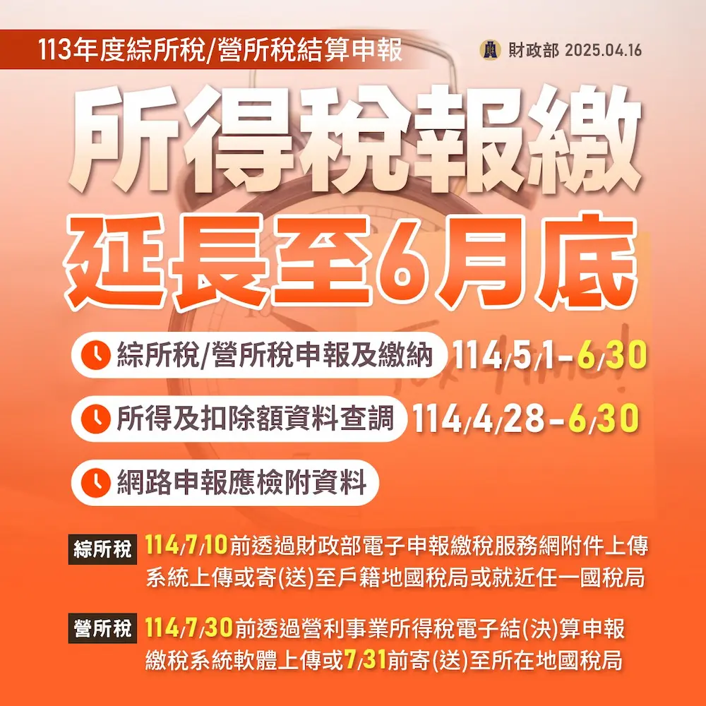 - 報稅申報與繳納期間:2025年5月1日(四)0:00 起至6月30日(一)23:59 止。