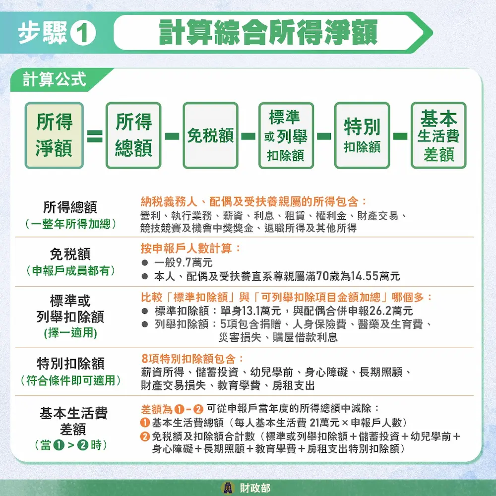 【綜合所得淨額計算公式】綜合所得淨額=所得總額−免稅額−標準或列舉扣除額−特別扣除額−基本生活費差額