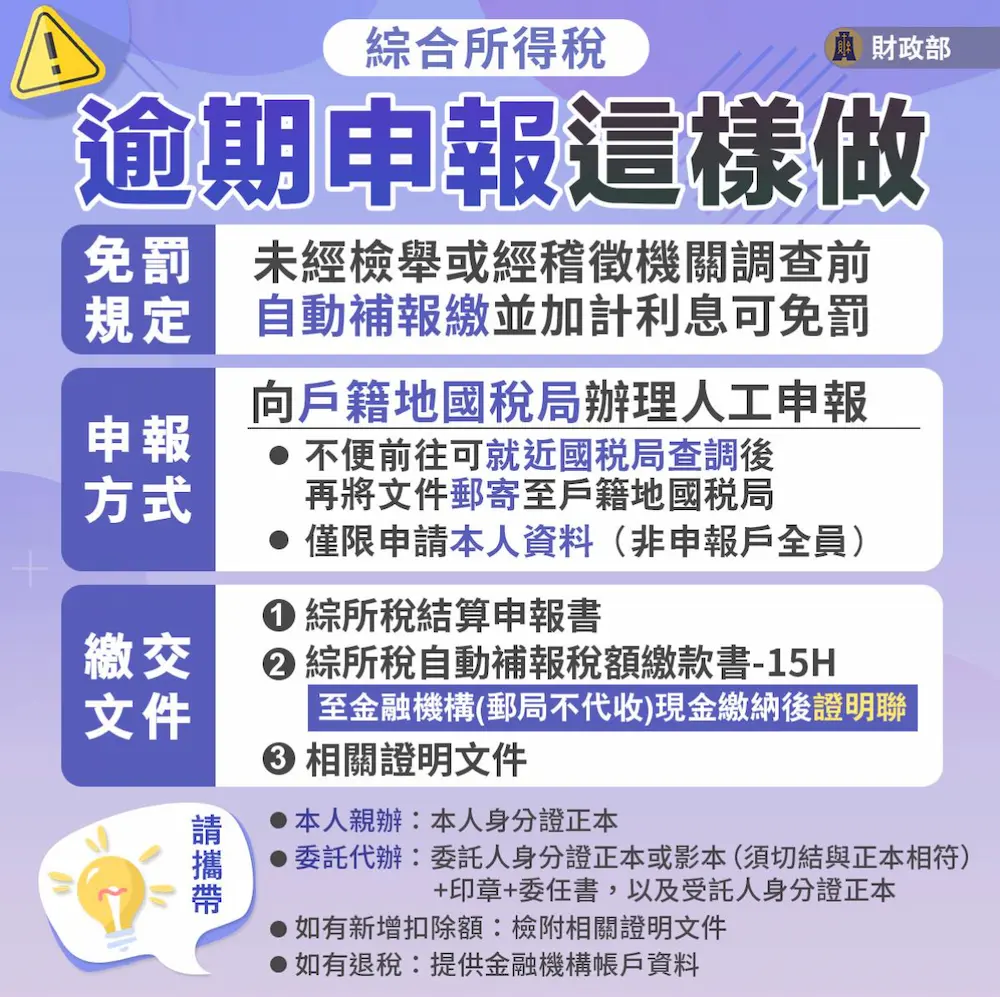 一旦發現錯過申報期限(2025年6月30日止),應儘速親赴國稅局補辦申報,準備資料與正常申報相同,需備妥身分證件、綜所稅結算申請書、補繳稅額繳款書、各類憑證與相關證明文件。