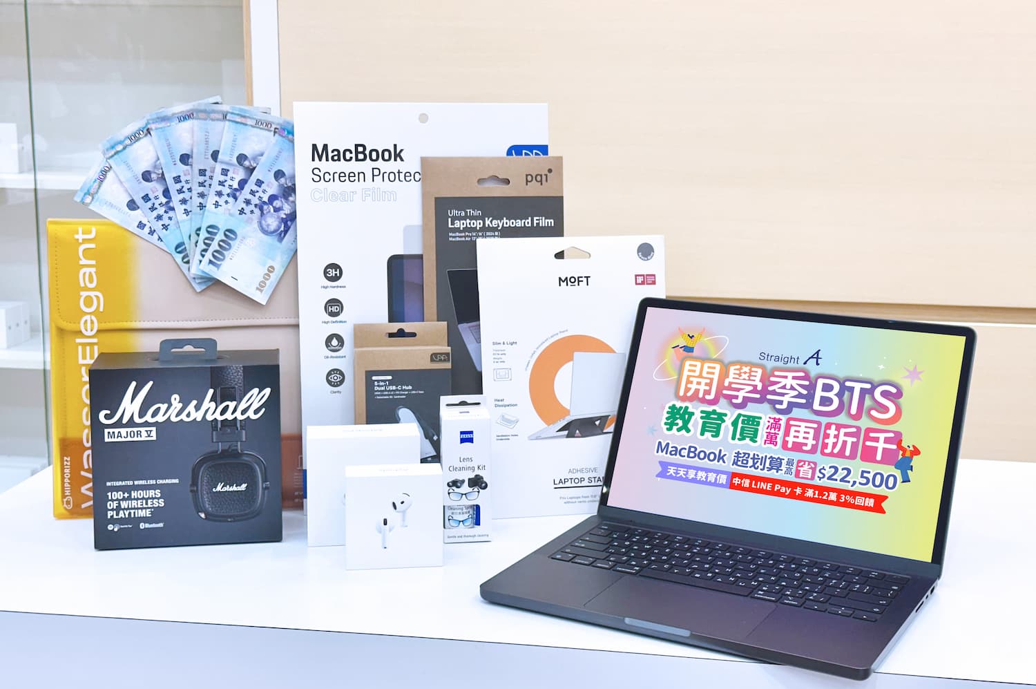 - 好禮自由選:除了「滿萬折千」,還可選擇價值 $4,780 的「澎湃大禮包」(含電腦包、保貼、轉接器、鍵盤膜、清潔組、支架),或教育價 4 萬元以上機型贈 Marshall 耳罩式耳機(價值 $4,990)!