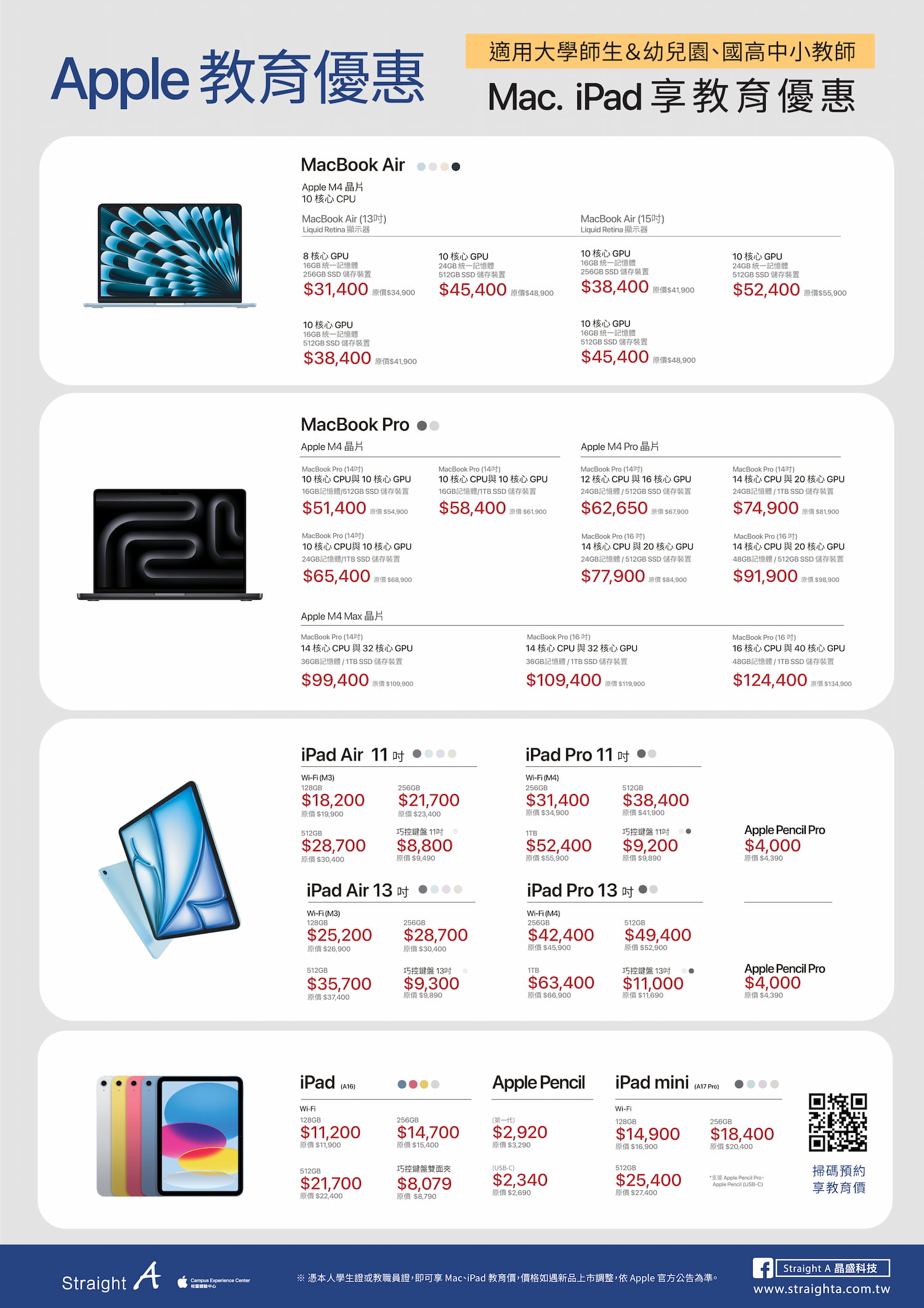 代表除了大學教職員外,就連同全台高中職學生與教師(包含幼兒園至高中)也能憑有效證件,在 Straight A 全台 16 家校園門市或官網,同享 Apple 產品的教育優惠。