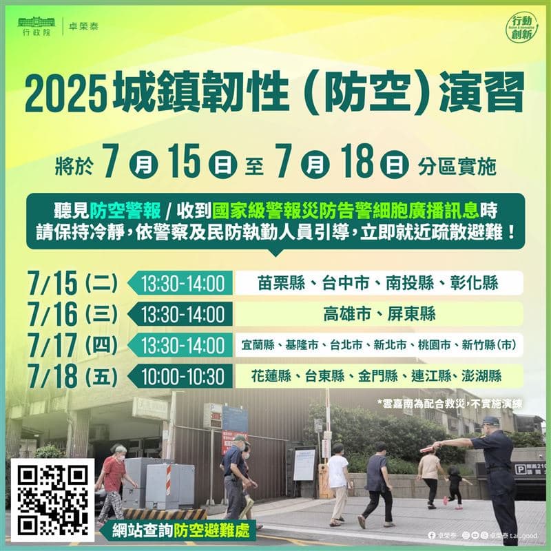 2025年城鎮韌性(防空)演習於中部率先登場,演習縣市包括台中、南投、彰化、苗栗、雲林及嘉義地區,這也是台灣首次將傳統萬安、民安演習結合的全民防災實作,強化城鎮戰時韌性與日常災防意識。本文會整理中部縣市防空演習2025時間資訊,以及演習期間在外面、開車或搭乘捷運/公車要注意哪些事情才不會受罰,各種演習交管制與注意事項也都會一併整理。