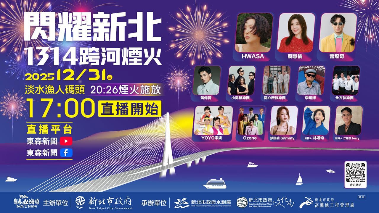 2026年新北跨年直播來了!「閃耀新北1314跨河煙火」將於12月31日在淡水、八里雙主場盛大登場,除了史上規模最大的跨河煙火秀,更邀請到韓國天后華莎、日本創作歌手樋口愛等國際巨星壓軸,搭配雙舞台演唱會、市集與系列活動,為全台民眾帶來一場跨年盛宴,如無法親臨現場的觀眾,也能透過本篇以多個平台同步線上看新北跨年直播。