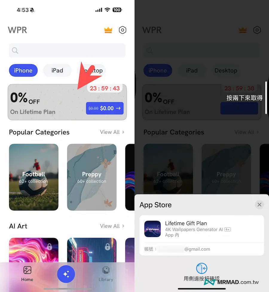 目前 4K Wallpapers Generator AI 也正推出終身專業版限時免費活動,取得方式很簡單,只要開啟 App主頁面後,就會出現永久解鎖專業版提示,按下「0% OFF On Lifetime Plan」,就能以0元限時免費取得,透過 Apple ID 認證就能永久取得永久專業版資格。(如顯示價格代表活動結束)