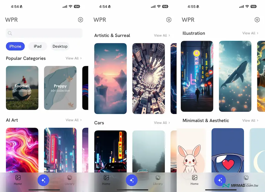 除了可以透過AI生成桌布外,在主畫面還提供多由 AI 產生的 HD 或 4K 高畫質桌布圖檔,能夠依照不同分類和設備自行選擇下載。