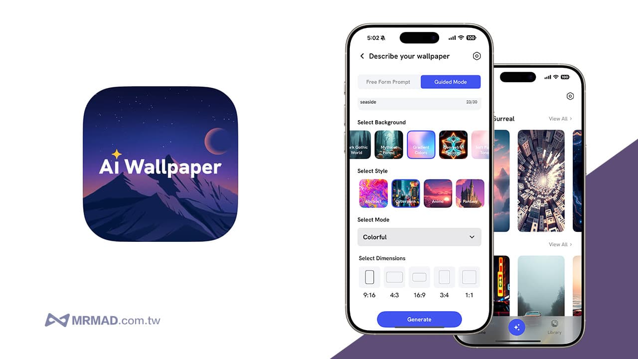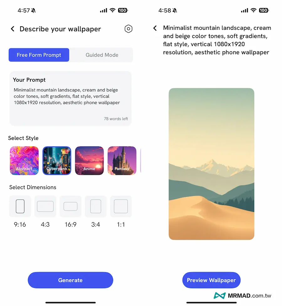 實際測試發現,《4K Wallpapers Generator AI》還能夠自行選擇要呈現的圖片風格,以及支援多種長寬比,像是16:9、9:16、4:3、1:1都能夠自訂,能依照自己喜好設計出iPhone、Android、iPad或電腦桌布。