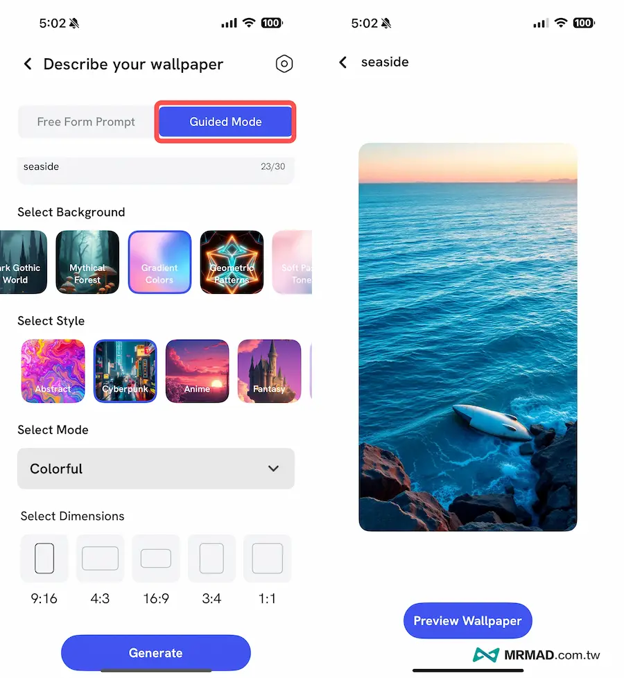 如果不曉得要如何輸入生成桌布指令,也可以切換到「Guided Mode」引導模式,只要在欄位內簡單輸入要產生的桌布風格或主題英文單字,底下選擇背景風格、主題和尺寸後,按下「Generate」就能立馬產生對應的桌布圖片。