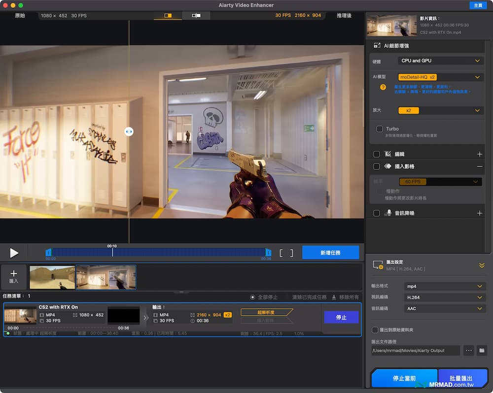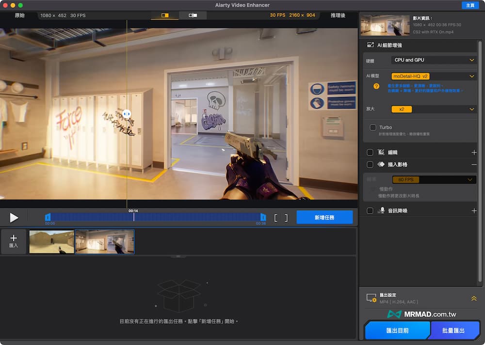 最後都確認後,就能透過右下角設定輸出格式、影像和音訊編碼,Aiarty Video Enhancer 還有更能完整發揮 GPU 加速轉檔。