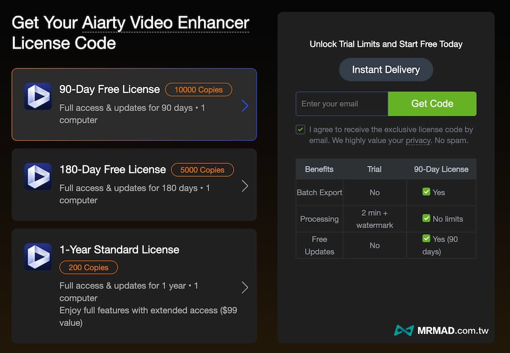 目前Aiarty官方正推出Aiarty Video Enhancer限時免費授權活動,提供90天、180天甚至1年完整功能授權,能夠享有無水印、無長度限制,主要取得條件如下: