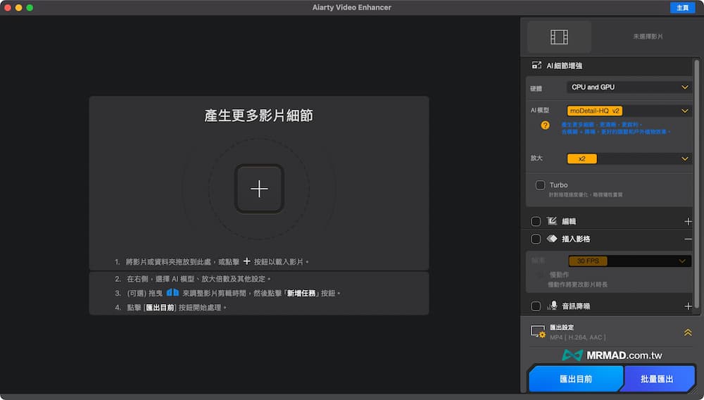 Aiarty Video Enhancer 不管是在Windows與Mac上介面基本都是相同,而且能夠完全離線運算,不需將影片上傳雲端,還能兼顧隱私與安全,底下就分享基本使用方式: