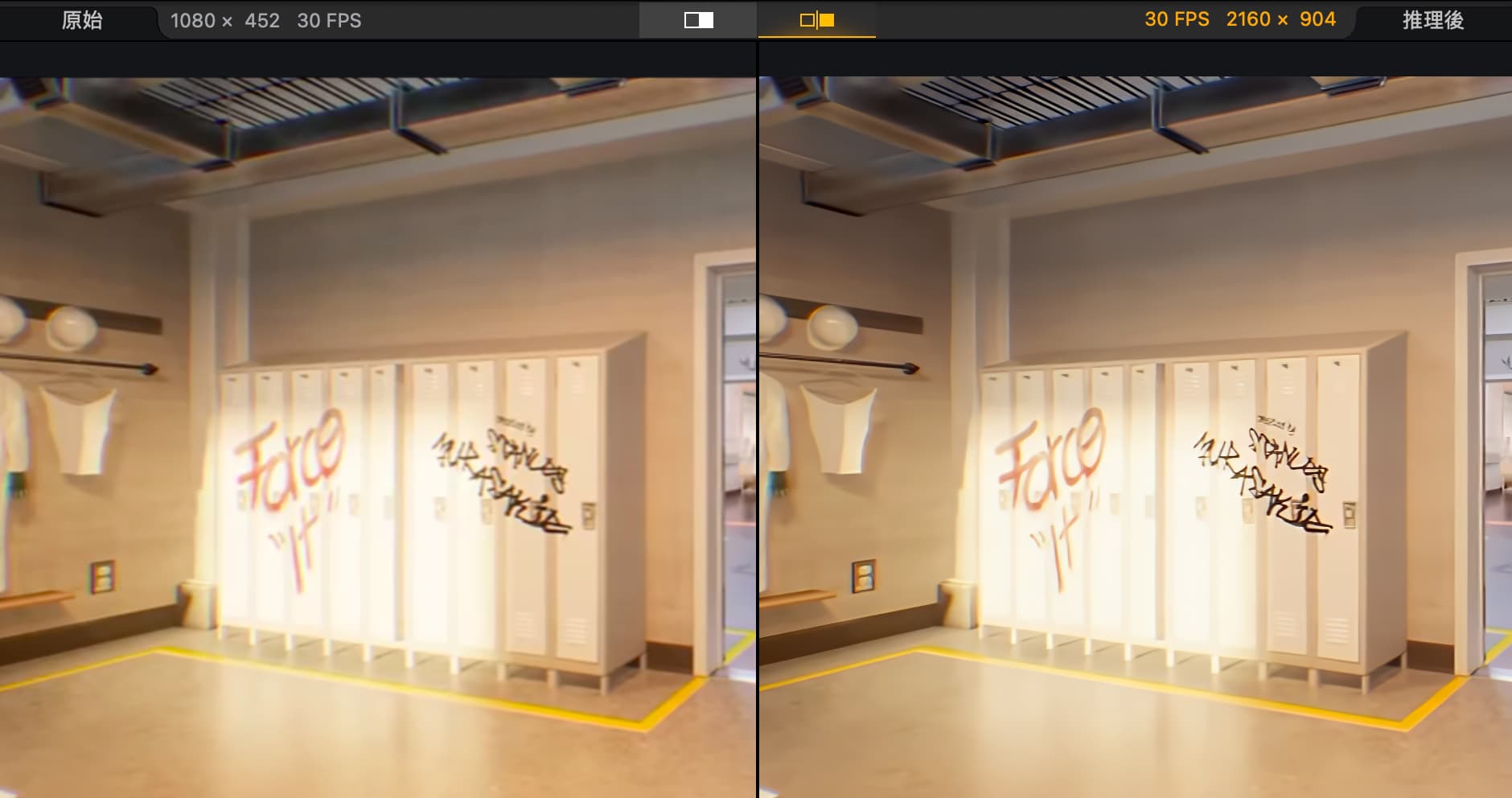 實際可看底下遊戲場景內的櫃子畫面,左側是原始遊戲畫面會呈現模糊感,在經過 Aiarty 工具修復後,櫃子和天花板和地板材質細節完全出現,噴漆的字體也更清晰細緻。