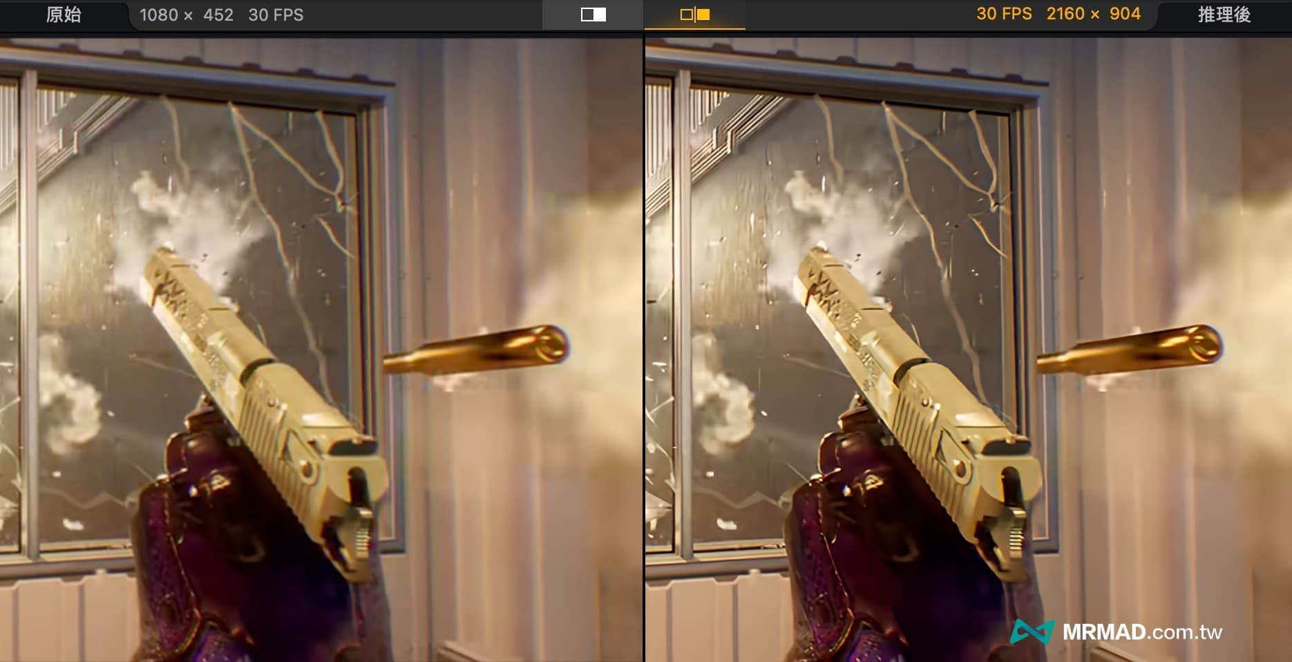 實際用遊戲畫面來測試補幀效果也非常明顯,在開槍射擊時,原本畫面會讓槍身產生動態模糊感,在經過 Aiarty Video Enhancer 修復過後,沙漠之鷹也變得更清晰、光影顏色也都保持原樣,就連同後方破裂的玻璃也都更明顯細緻。