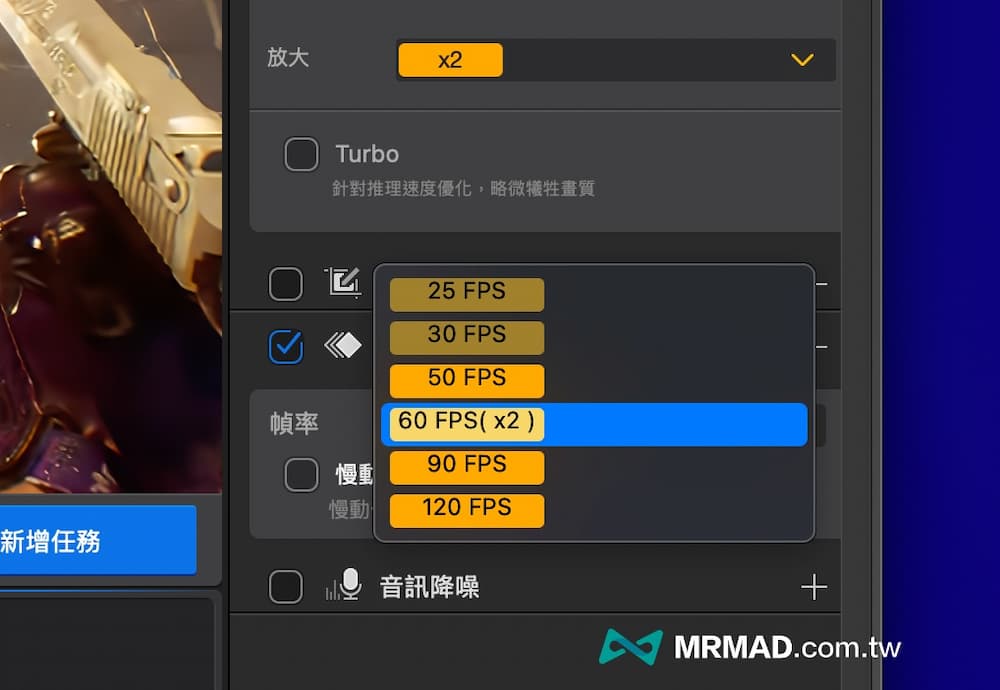 在設定內還能夠針對影像畫面提供AI補幀技術(最高120FPS),可將 24fps 或 30fps 畫面提升至 120fps、240fps 等高幀率,非常適用在縮時攝影、慢動作與動畫場景等,能夠讓慢動作、動畫、運動畫面自然流暢,無果凍或殘影問題。
