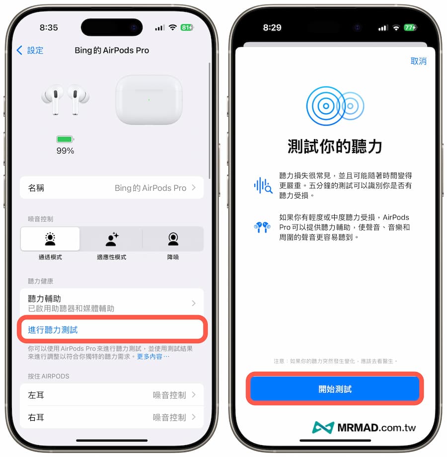 隨後透過iOS「設定」內點入「自己AirPods設備」名稱,按下「進行聽力測試」,就會啟用AirPods聽力測試功能。