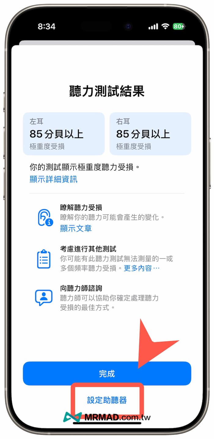 要開啟AirPods Pro助聽器功能,可以直接在聽力結果頁面最底下「設定助聽器」。