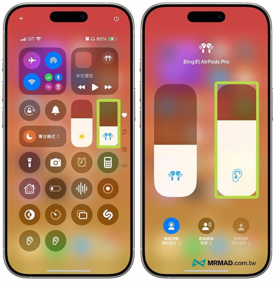 在開啟AirPods Pro助聽器功能後,往後就可以透過iPhone右上角下拉控制中心去調整收音大小,蘋果也提醒部分用戶可能需要經過數小時或數週時間,才能夠完全習慣AirPods助聽器效果。