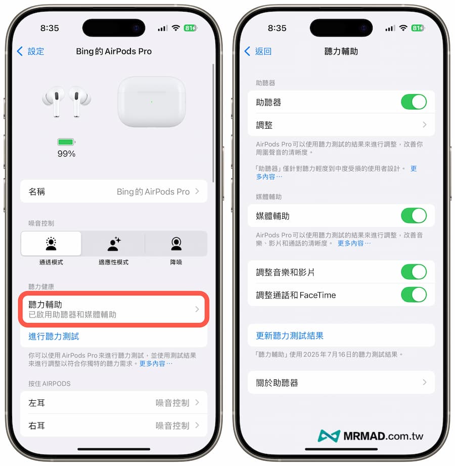 又或者可以透過 AirPods Pro 設定內開啟「聽力助聽」功能,裡面還能夠調整助聽器接收的周圍聲音,以及提高不同音調和頻率,甚至底下還能夠開啟多媒體輔助聽力增強,能夠利用聽力測試結果來強化音樂、影片、通話和 FaceTime 視訊對談聲音效果。