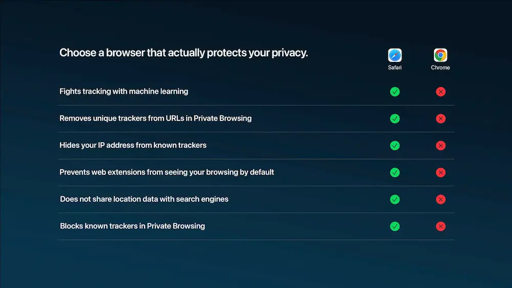 Apple 甚至提供給媒體一張 Safari 與 Chrome 的對比圖,明示 Safari 在隱私保護上的優勢,企圖要拉攏對個資敏感的用戶群,建議在 iPhone 上就要使用 Safari 瀏覽器才是真正安全。