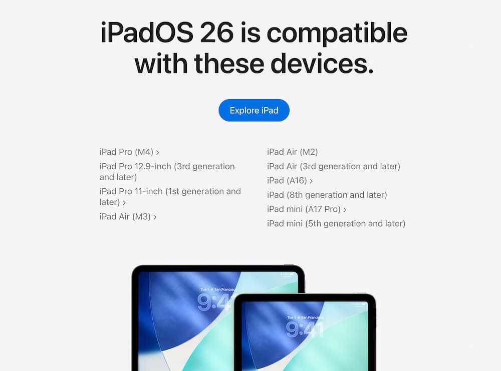 入門款 iPad 的 iPadOS 26 支援門檻被要求只有 iPad 第 8 代,代表多款搭載舊款晶片的型號將無法更新。