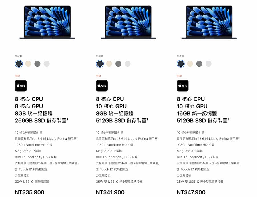 13吋 M3 MacBook Air 台灣售價(預設配置)