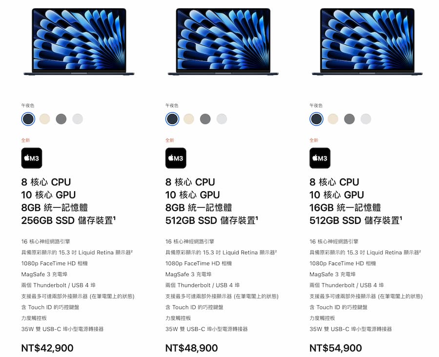15吋 M3 MacBook Air 台灣售價(預設配置)
