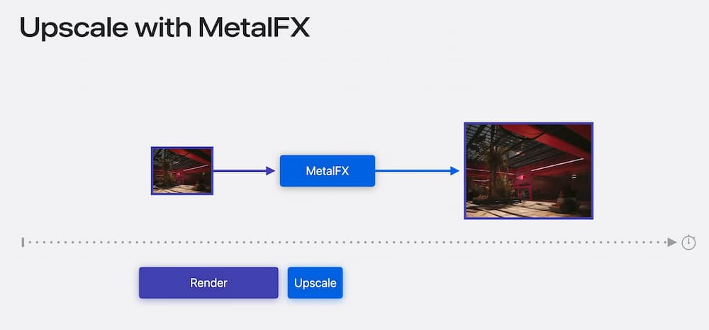 在了解 Metal 4 新功能之前,必須先理解蘋果 MetalFX 的基礎技術,MetalFX 升頻(upscaling)機制允許應用程式先渲染較低解析度的影像,接著再透過升頻技術輸出高解析度畫面,藉此大幅節省 GPU 運算時間,提升幀率表現,同時維持畫質不過度犧牲,這項技術雖非全新,已成為近年 Mac 上開發遊戲的效能標配。