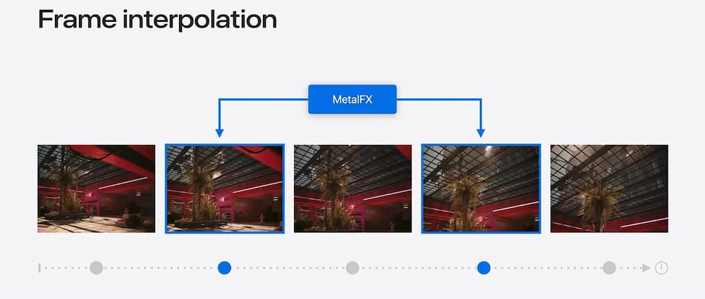 Metal 4 首度導入畫面「幀生成」技術(Frame Interpolation),其原理類似 PC 遊戲 NVIDIA DLSS 3 常見的 Frame Generation 機制,能透過分析畫面中的動態向量與景深資料,MetalFX 能夠預測物體移動方向,並在兩個實際渲染的幀之間,生成補間畫面,進一步提升流暢度。