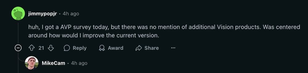 比較有趣的是,部分 Vision Pro 用戶收到的問卷內容與上述版本不同,Reddit 網友 jimmypopjr 分享,他所收到的問卷集中在 Vision Pro 的改進建議與使用感受,並未提及任何潛在新產品,這樣的差異性設計也符合 Apple 一貫針對不同用戶群進行細緻資料蒐集的策略。