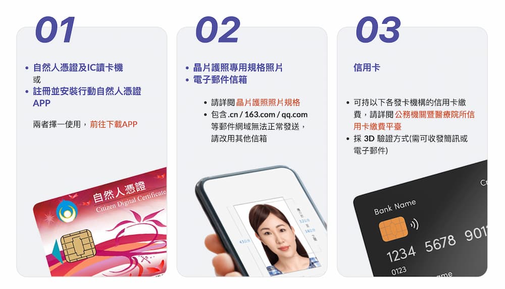 如果個人想線上申請(換發)護照,必須同時符合三項條件: