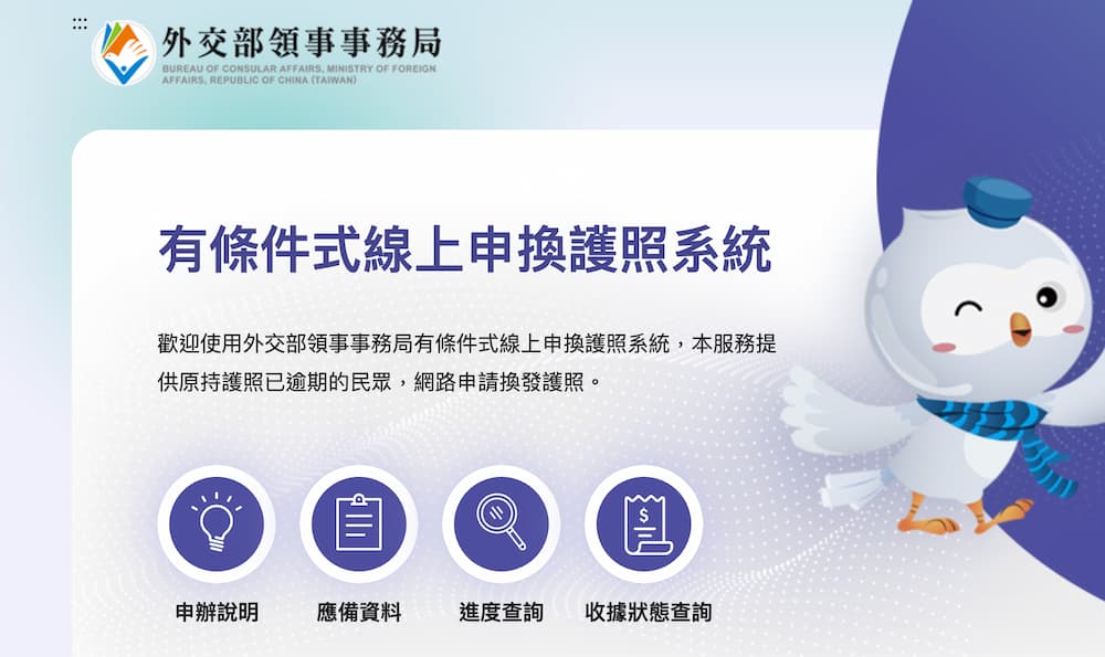 💡 提醒:要是需要更改姓名、外文別名、加註僑居身份,或是持有第二本護照,需要親自或委託到臨櫃辦理申請,無法直接透過線上申請換護照。