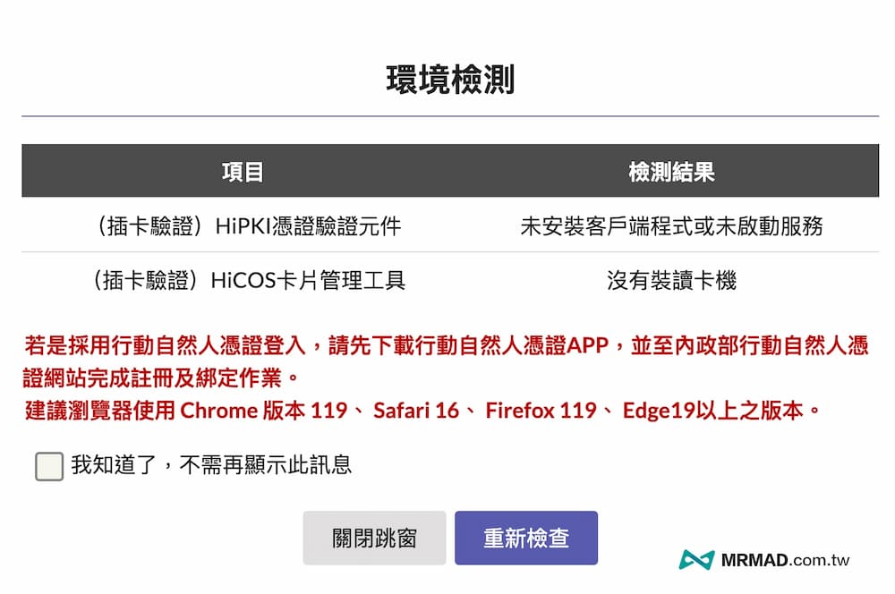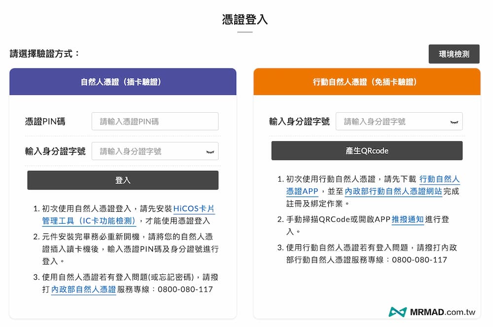 過程會依照行動裝置或電腦環境檢測,如果是行動自然人憑證登入,請先下載行動自然人憑證APP;要是透過電腦瀏覽器只能支援Chrome 版本 119、 Safari 16、 Firefox 119、 Edge19以上之版本,並依照頁面提示檢查HiPKI憑證驗證元件和將自然人憑證插入讀卡機內。