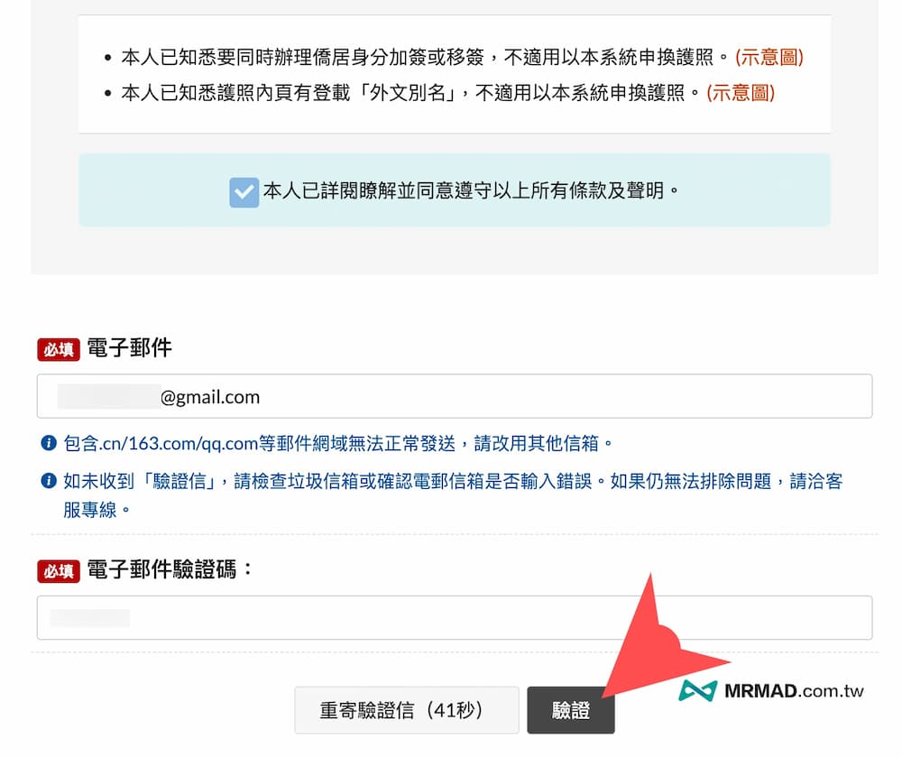 在申請過程會需要先同意條款聲明,並且先輸入能正常收信的Email,並且要輸入電子郵件驗證碼後,點擊「驗證」才能夠開始線上申請流程。