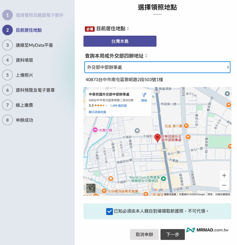 接者會下你選則要在哪個縣市外交部領取護照,直接選擇居住地和外交部領取辦事處即可。