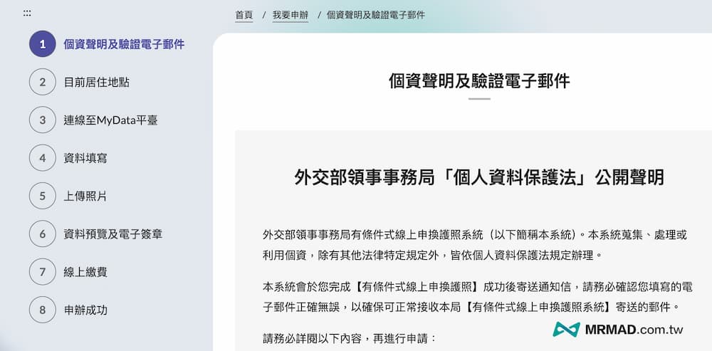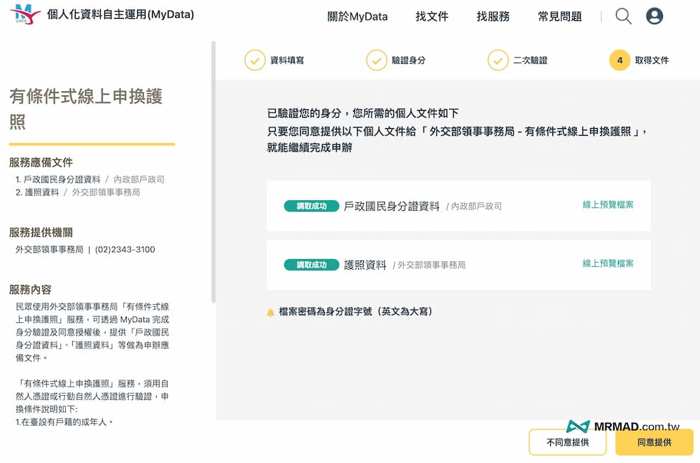 隨後系統會自動開啟個人化資料自主運用(MyData)平臺,需先驗證後,就會調用國民身分證資料和護照資料,這步驟主要是驗證是否為本人申請,以及護照是否有過期。