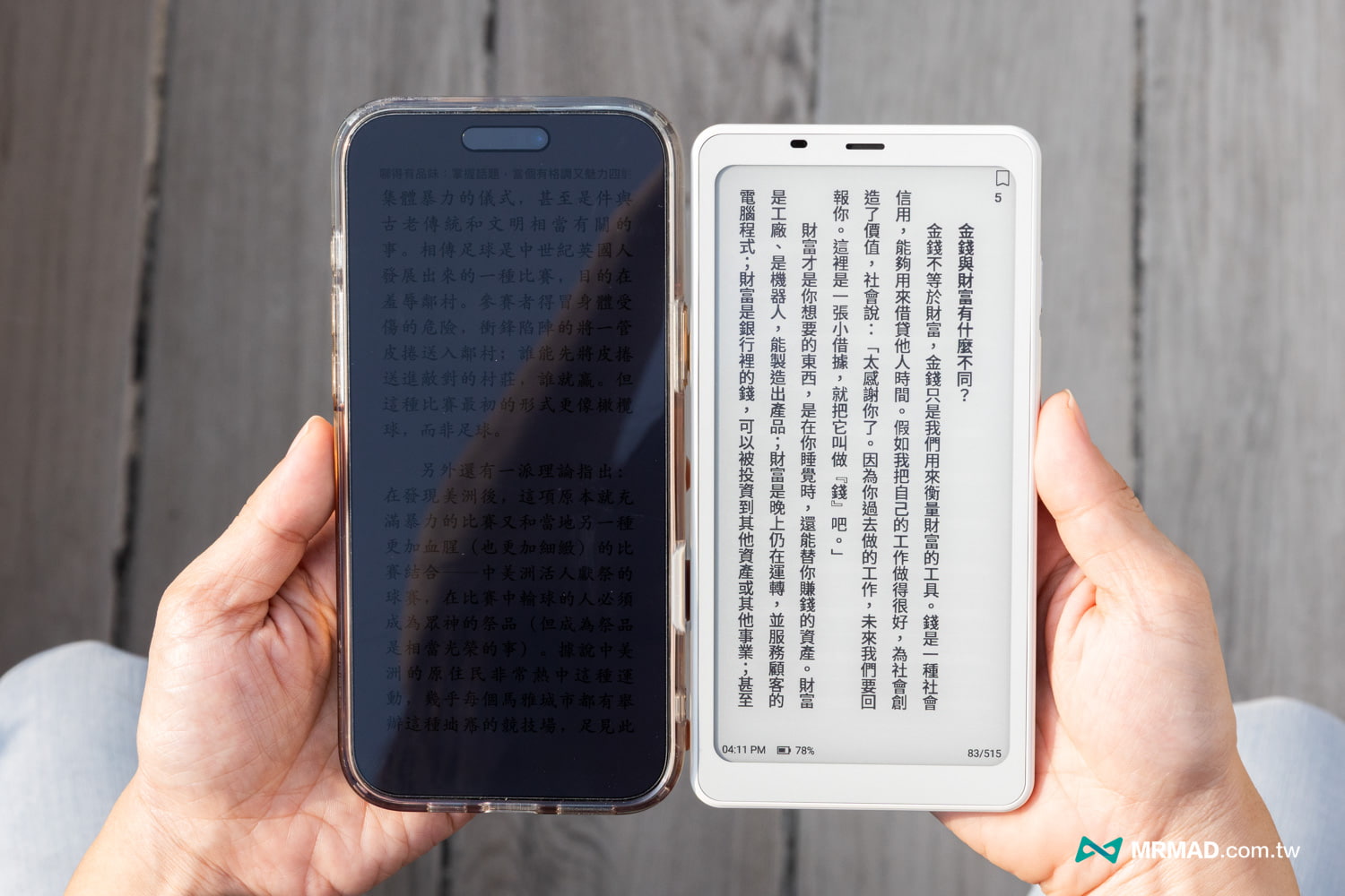 另外還有一項是 iPhone、Android 和平板追不上電子墨水螢幕的特色,也就是在室外閱讀電子書時,在E Ink 電子墨水螢幕顯示上依舊能夠清晰顯示,如下圖直接用 BOOX Palma 2 和 iPhone 16 Pro Max 在室外閱讀下比較,能夠發現螢幕顯示效果直接是 Palma 2 完勝。