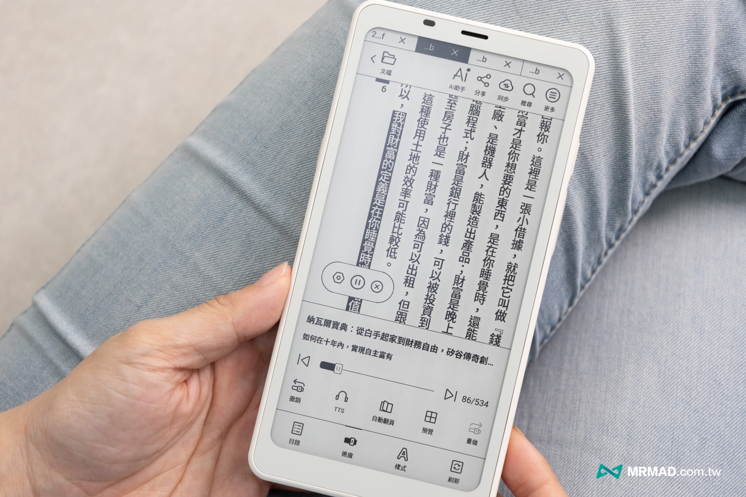 除了可以閱讀電子書外,文石BOOX Palma 2 還支援 TTS 語音朗讀功能,當你在 NeoReader 閱讀應用中開啟任何支援的文件格式,只需點擊進度選項中的TTS 按鈕,就會自動啟動語音朗讀,等同就像是語音朗讀,能夠當成聽小說方式。
