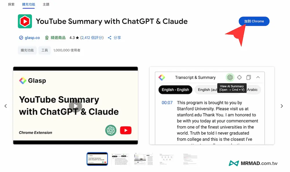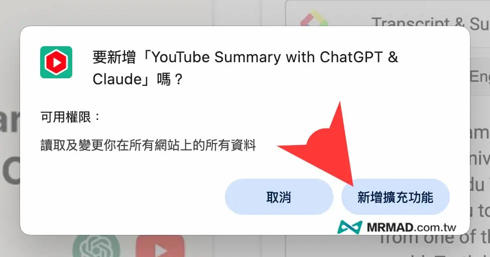 直接透過瀏覽器打開「YouTube Summary with ChatGPT」擴充插件功能,並點擊「加到Chrome」,然後然後確認新增擴充功能。