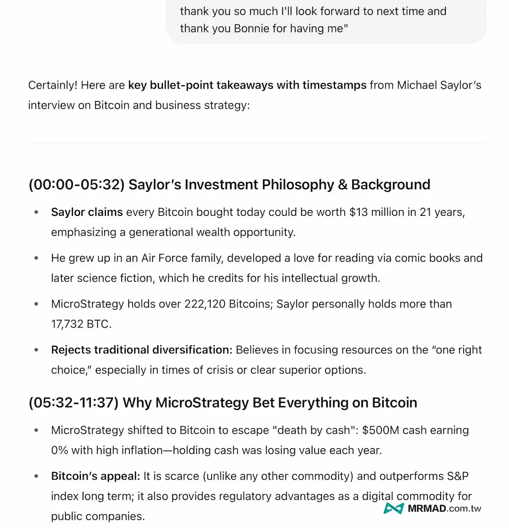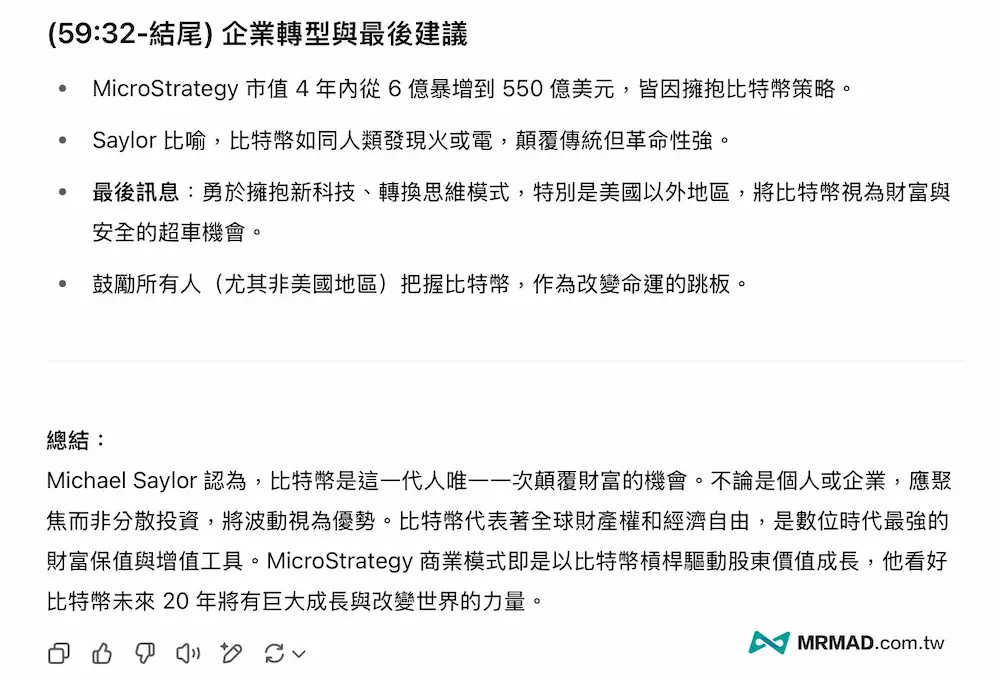 而且最終要是 ChatGPT 不只有會將 YouTube 影片整理出重點,最後還會替這部 YouTube 整理出重點總結。