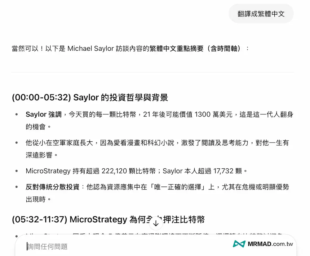 隨後ChatGPT就會自動將YouTube影片整理出重點摘要,並且還會分成幾分幾秒分段標題和重點細節。