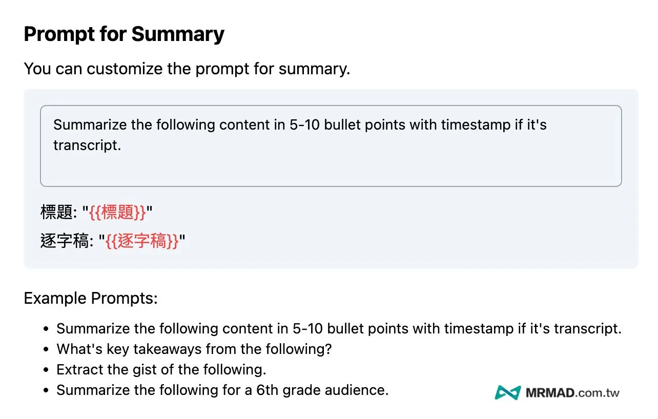 要是想要自訂ChatGPT YouTube摘要重點指令,也可以直接透過 YouTube Summary with ChatGPT 設定內自訂「摘要提示詞」,在最上方的大框裡,填入自己要用的「指令模板」。