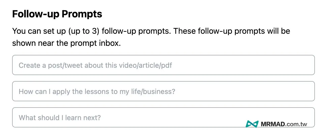 這欄位能夠自訂1~3 個「後續問題」按鈕,方便後續可以快速點擊,就能繼續詢問第二步互動指令,像是可以輸入「以這支影片/文章內容發一篇貼文」、「我要如何應用這些重點到工作/生活?」、「下一步我該學什麼?」等。
