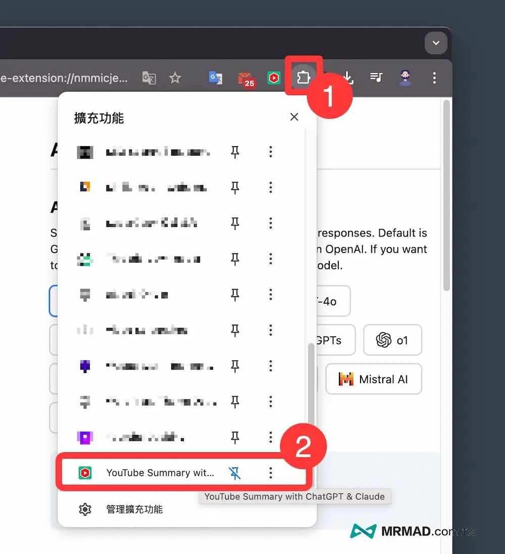 安裝完成後,先點擊Chrome瀏覽器工具列上的「擴充功能」餅乾圖示,選擇「YouTube Summary」,開始設定 YouTube Summary with ChatGPT 設定,不需要常駐在瀏覽器上。
