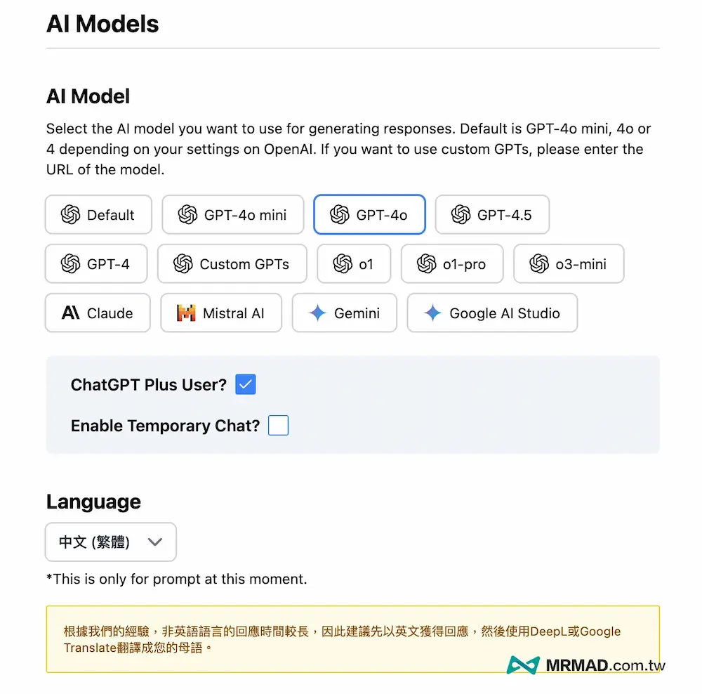 底下也可以勾選是否有付費 ChatGPT Plus 會員資格、臨時聊天,以及預設AI語言語系,直接選「中文(繁體)」,其餘底下都不需設定。