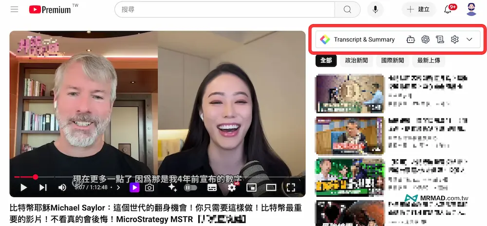 接下來打開 YouTube 影片頁面,在右上角會看見「Transcript & Summary」按鈕,能夠展開YouTube逐字稿功能選單。