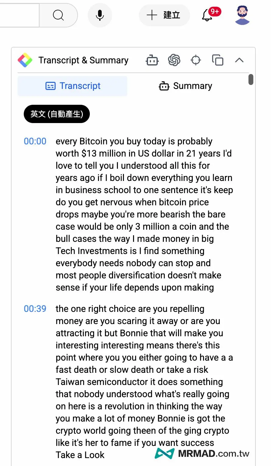 插件工具就會自動讀取YouTube字幕,或將影片生成逐字稿,就算沒有英文同樣也會由系統自動產生。