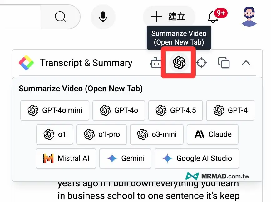 直接點擊「ChatGPT」圖示,可以自訂選擇要將YouTube影片逐字稿內容,透過哪個ChatGPT模型來執行。