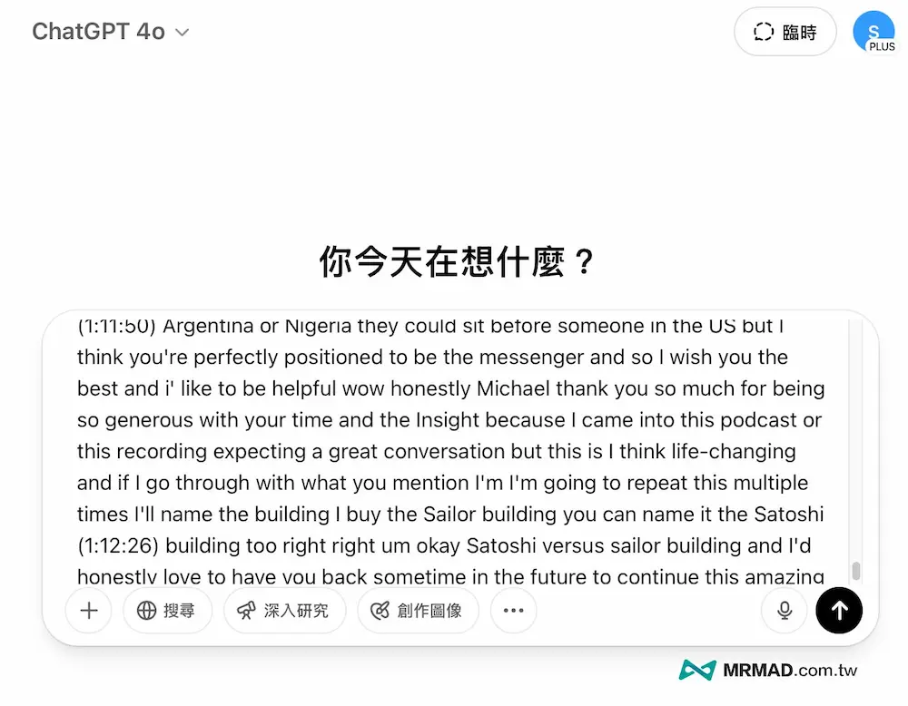 像是選擇ChatGPT-4o模型後,就會自動將預定寫好的YouTube重點摘要指令,直接透過ChatGPT分頁開啟,並且會直接將指令填入對話框內,按下右下角「送出」即可。