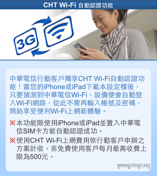 中華最近準備在2013/1/15加入自動連線到『CHT Wi-Fi Auto 』,顧名思義就是完全自動連線,小編在公司上班旁邊也突然增加了這分流的Auto的AP,研究一下原來是要讓手機自己連線使用,原本的CHT Wi-Fi被設定如果十分鐘沒任何動作,就直接被踢除 …目前也都只能用在ios設備上,如果你是android的用戶很抱歉目前還不支援,但如果你並非是中華用戶要小心,千萬不要使用這功能,避免你的荷包大縮水,那要如何使用呢? 就請依照下面教學