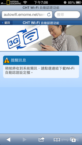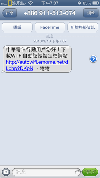 等個幾分鐘,就會收到此封訊息,在點選訊息中的網址下載Wi-Fi自動認證設定檔
