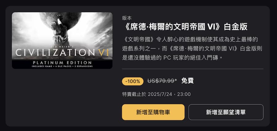 溫馨提醒:《文明帝國VI白金版》限免活動只到7月24日23:00,過後將恢復原價近NT$2,400,把握機會收下這款經典策略大作!